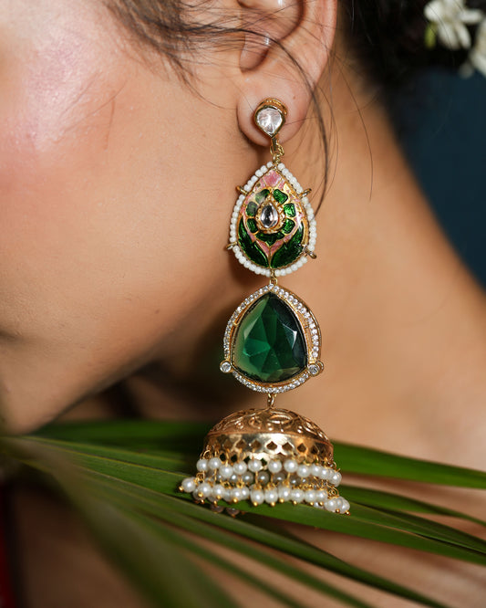 Hoor Green Jhumka Earrings (Invisible kaan chains included)