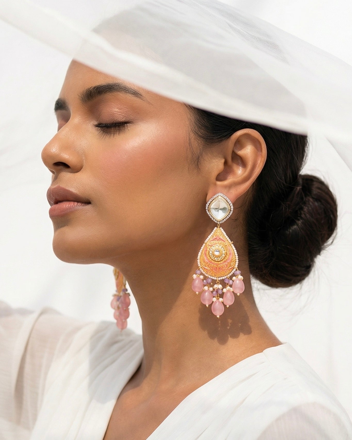 Discover the epitome of elegance with our Polki Meenakari Fusion Earrings. Handcrafted with precision and passion, these earrings feature intricate carnation pink meenakari detailing, adding a pop of color and charm. The combination of traditional Polki craftsmanship and modern design elements makes these earrings truly unique. Adorned with semi-precious beads, they radiate sophistication and grace. Elevate your look with these versatile statement pieces, ideal for both casual and formal occasions.