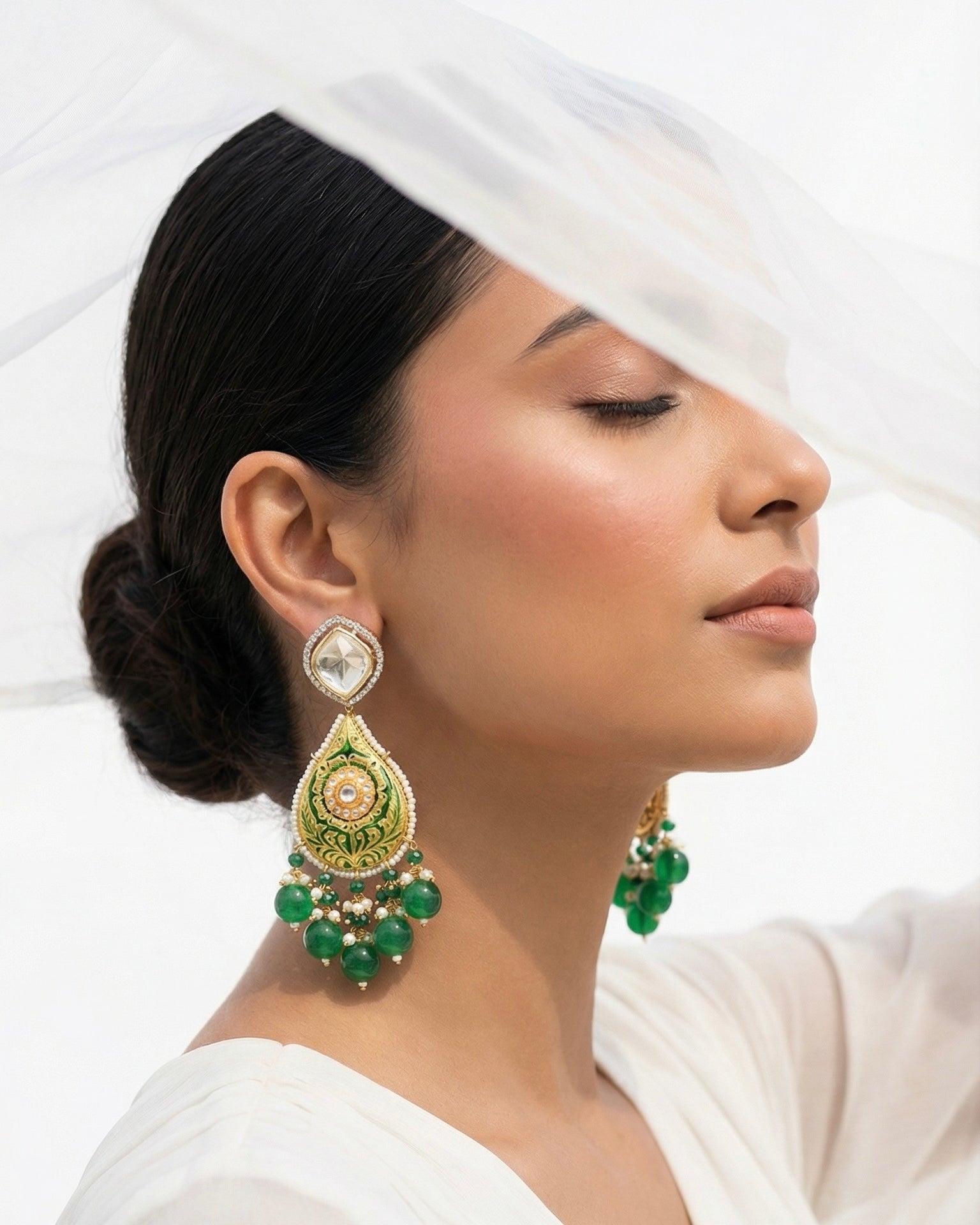 Discover the epitome of elegance with our Polki Meenakari Fusion Earrings. Handcrafted with precision and passion, these earrings feature intricate green meenakari detailing, adding a pop of color and charm. The combination of traditional Polki craftsmanship and modern design elements makes these earrings truly unique. Adorned with semi-precious beads, they radiate sophistication and grace. Elevate your look with these versatile statement pieces, ideal for both casual and formal occasions.